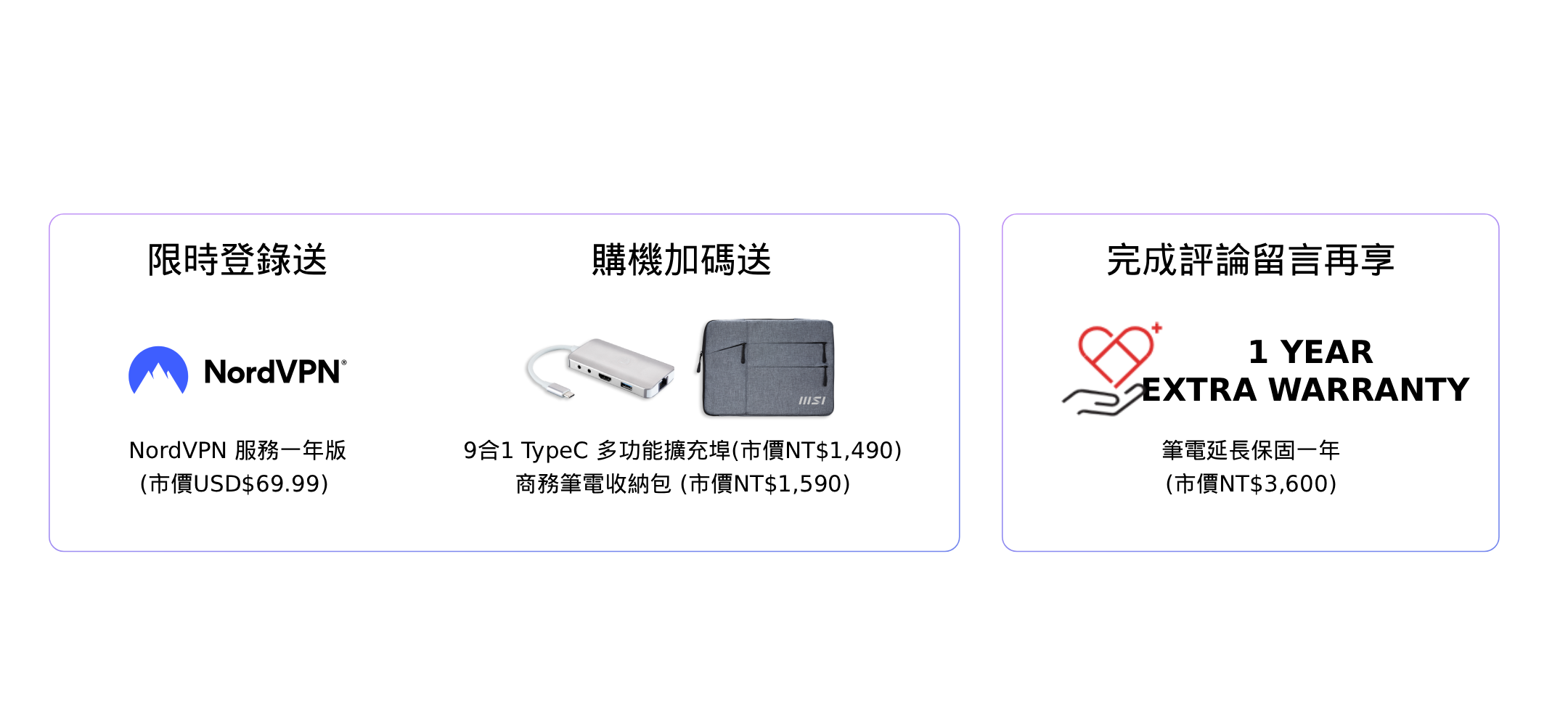 早鳥活動期間,選購指定款MSI Prestige筆電即可免費獲得NordVPN服務一年版、精緻筆電配件與筆電額外一年的延長保固。