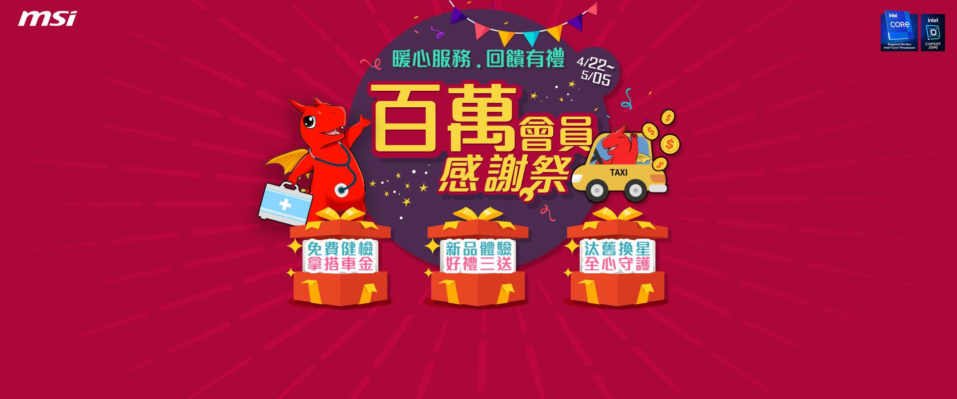 - 計程車優惠券(簡稱搭車金) 僅限定持有桌上型品牌電腦、微星主機板及顯示卡組裝電腦、AIO一體成型電腦之用戶申請,一人限領一次。申請時需憑健檢收執聯,至活動快閃體驗店(台北市中山區松江路7號1樓) 兌換乘車優惠碼。領取優惠碼後,用戶需於其手機APP輸入優惠碼以領取500元優惠券。領取時,用戶需下載55688 APP 並綁定支付方式;