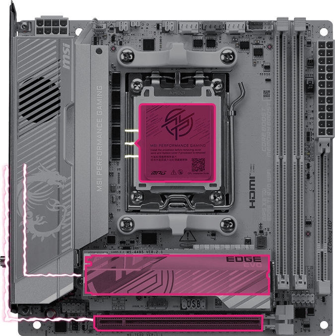 MPG X870I EDGE TI EVO WIFI 採用銀白配色,專為熱愛白色系主題電腦的玩家設計,不僅外觀亮眼,更具強大性能,搭載真正的 Wi-Fi 7、5G LAN、USB4 及最新 PCIe 5.0 支援,是專為 AMD Ryzen™ 9000 系列處理器打造的ITX 白色主機首選。