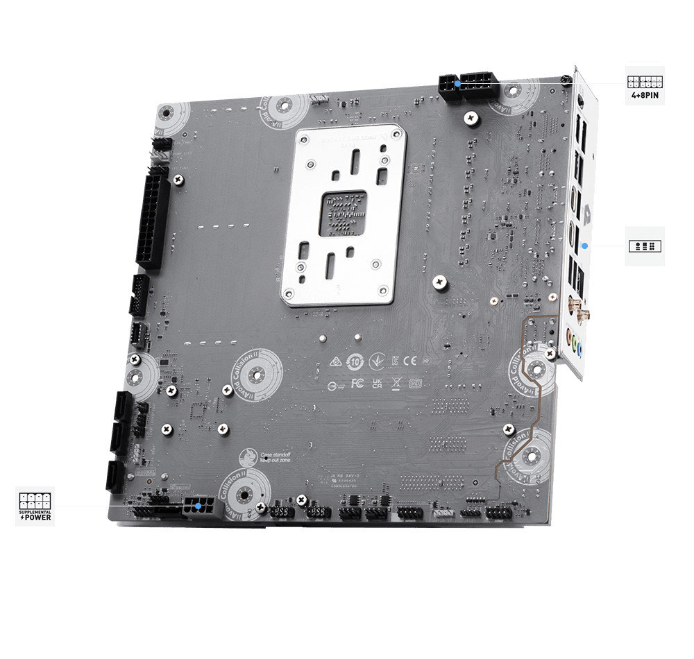 PRO B850M-A WIFI PZ 採用背插式設計,將主機板電源、CPU 電源、風扇連接埠、SATA 以及其他介面移至主機板背面。此設計讓理線更加簡潔,同時使整體系統外觀更乾淨、更具美感。.
