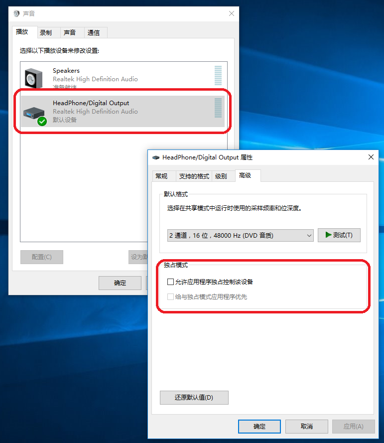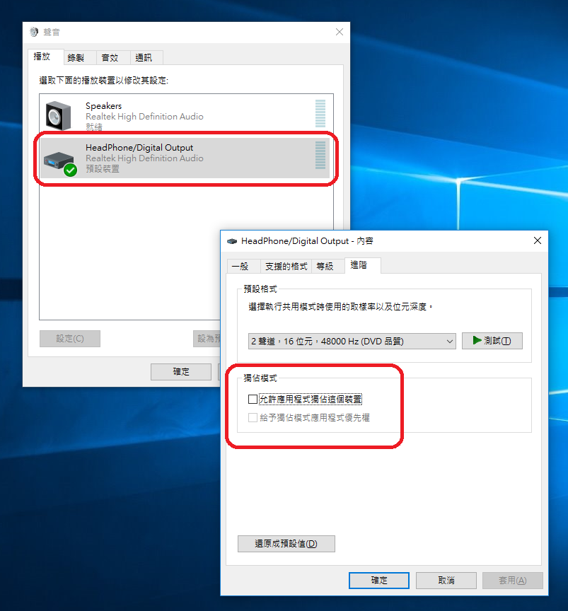 5. 取消勾選這個選項(請參考附圖):「允許應用程式獨佔這個裝置」。