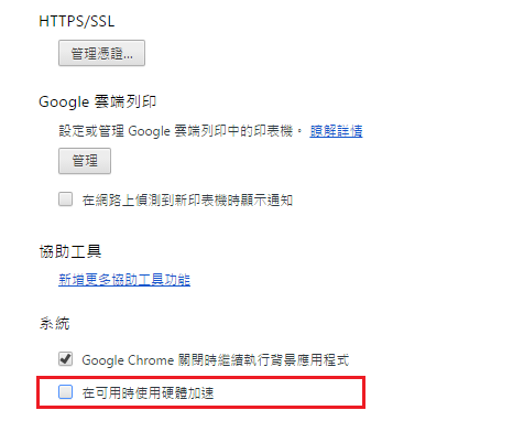 關閉瀏覽器進階設定中的「硬體加速」功能。