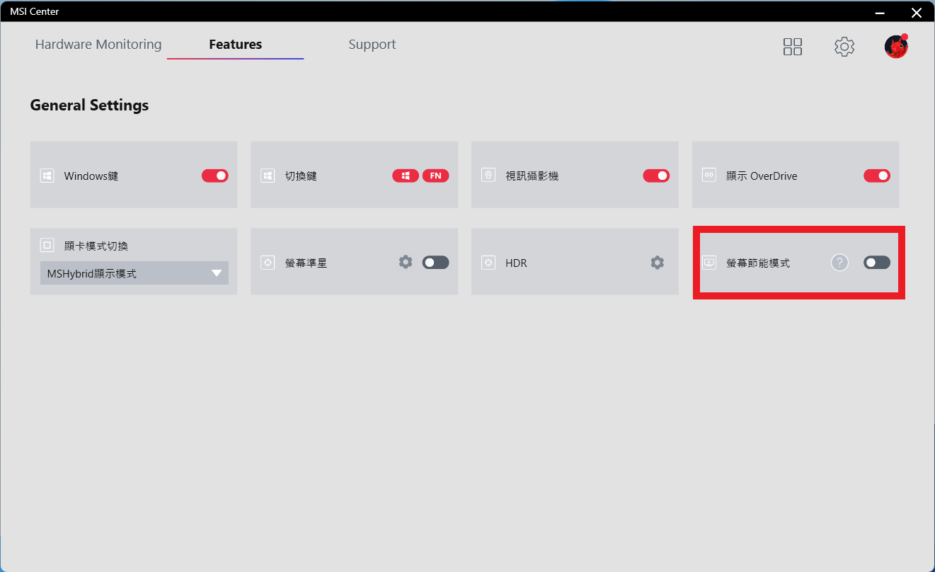 - MSI Center:開啟MSI Center > 功能 Feature > 一般設置 General Settings > 關閉“螢幕節能模式”