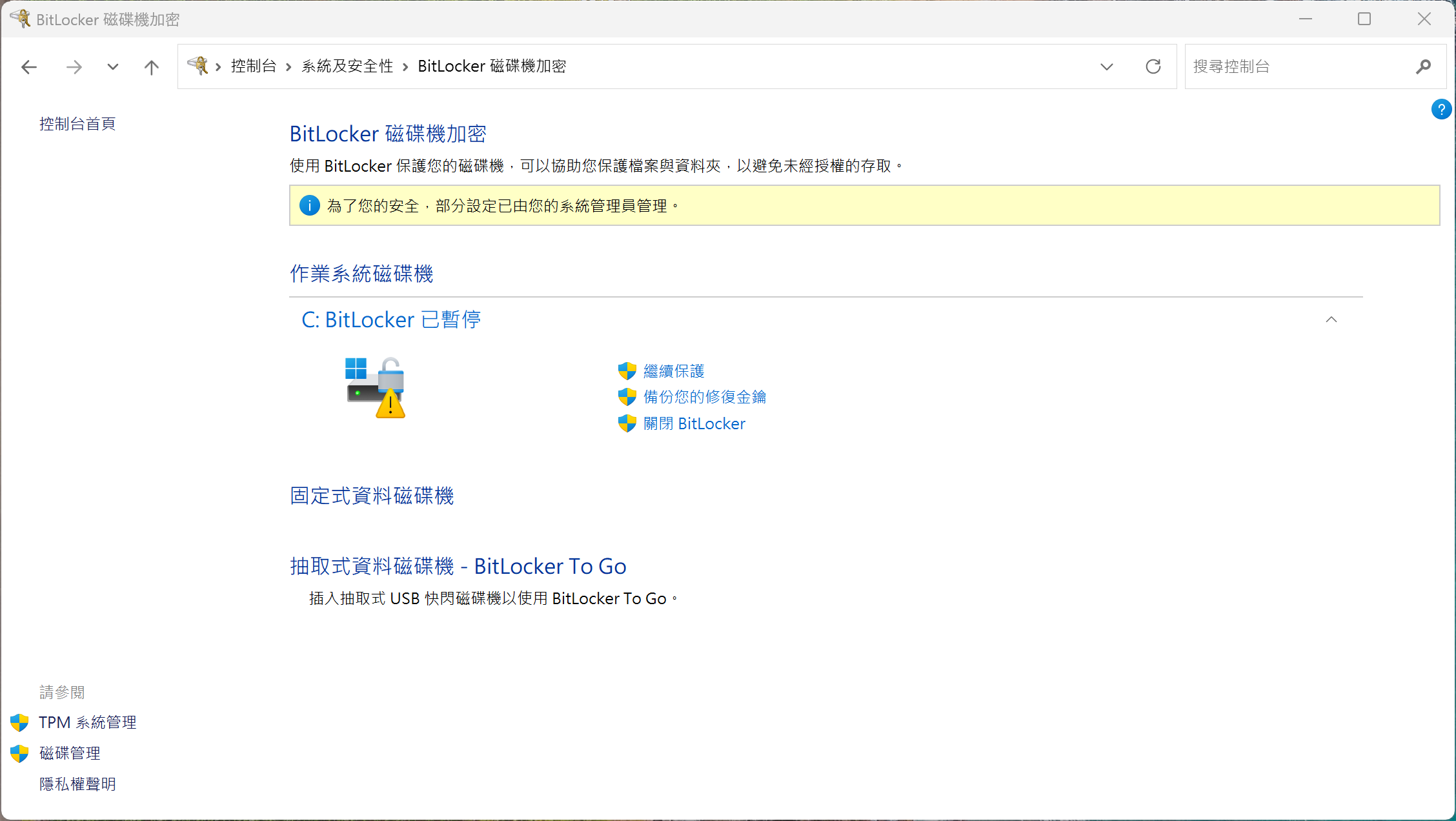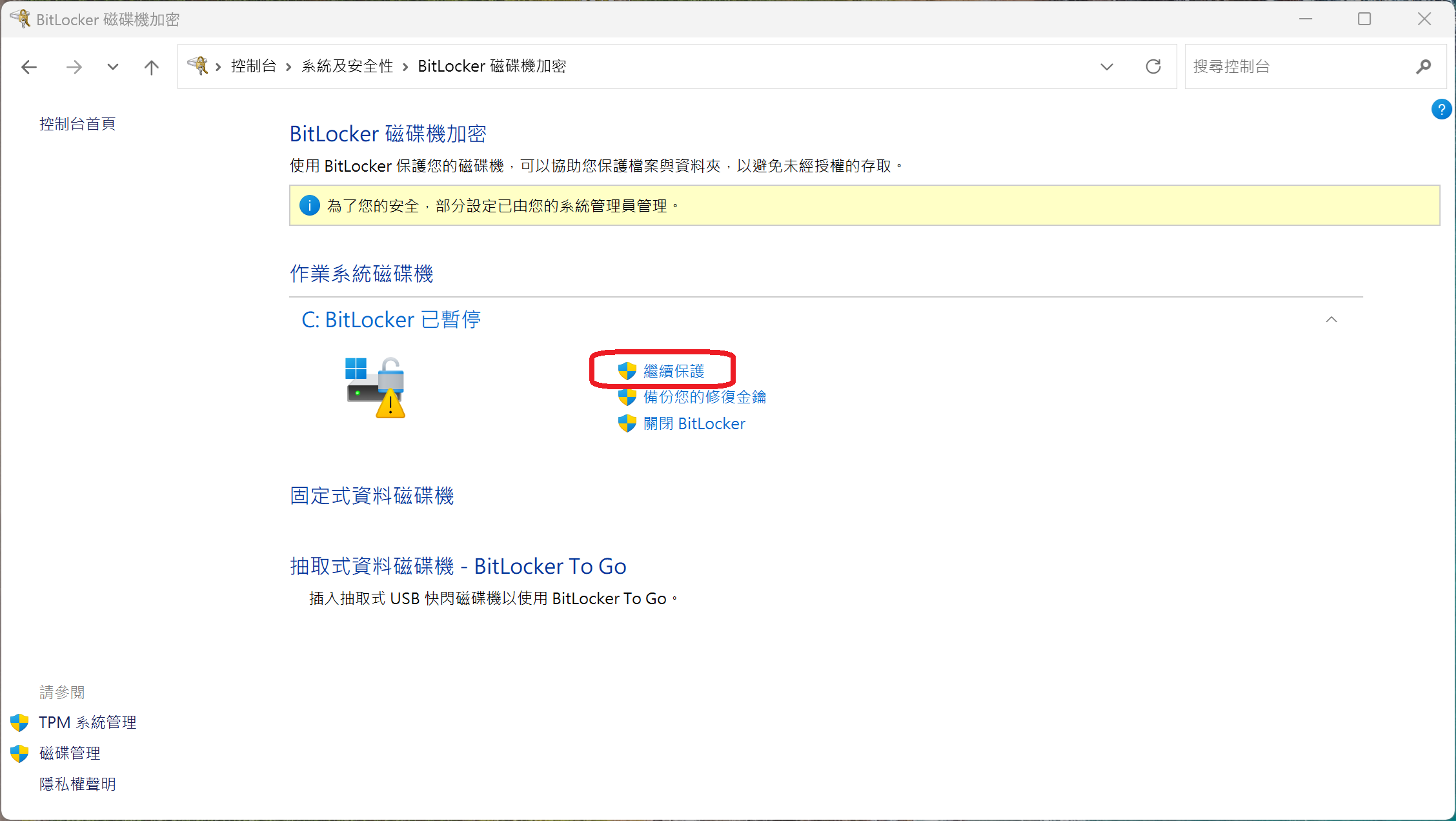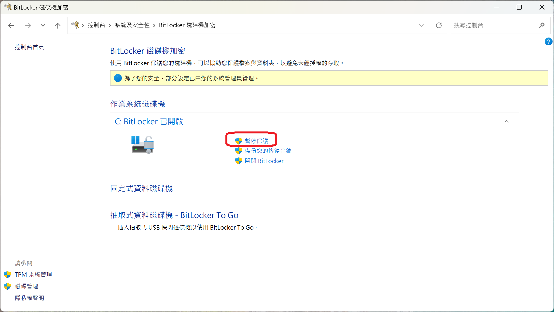 2. 選取[系統和安全性 > BitLocker 磁碟機加密 > 暫停保護]。
