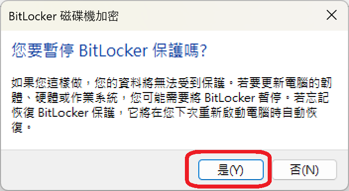 為避免反覆輸入 BitLocker 恢復密鑰,請按照以下步驟暫時暫停 BitLocker 保護。