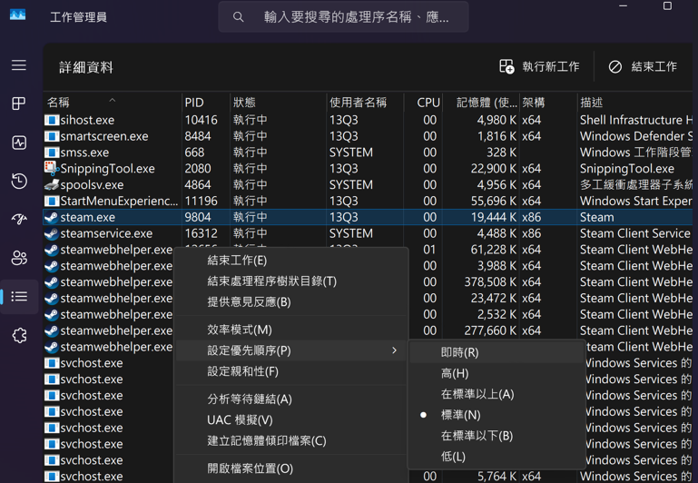 找到 steam.exe,右鍵點擊,選擇 設定優先級 > 高。