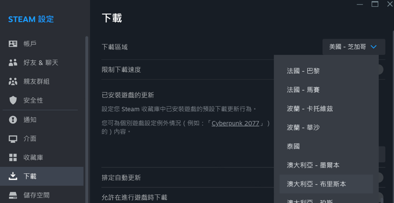 Steam 會根據您的位置自動分配下載伺服器,但如果當前所在地伺服器負載過高,更改伺服器位置可能會有所幫助。