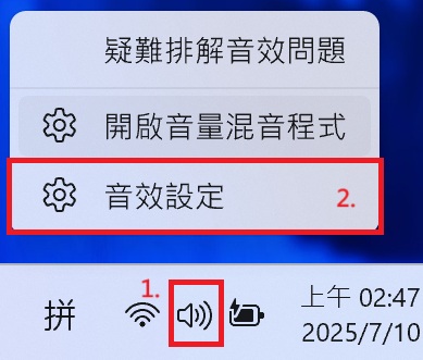 1.對桌面右下角通知區域內的喇叭圖示點選右鍵。