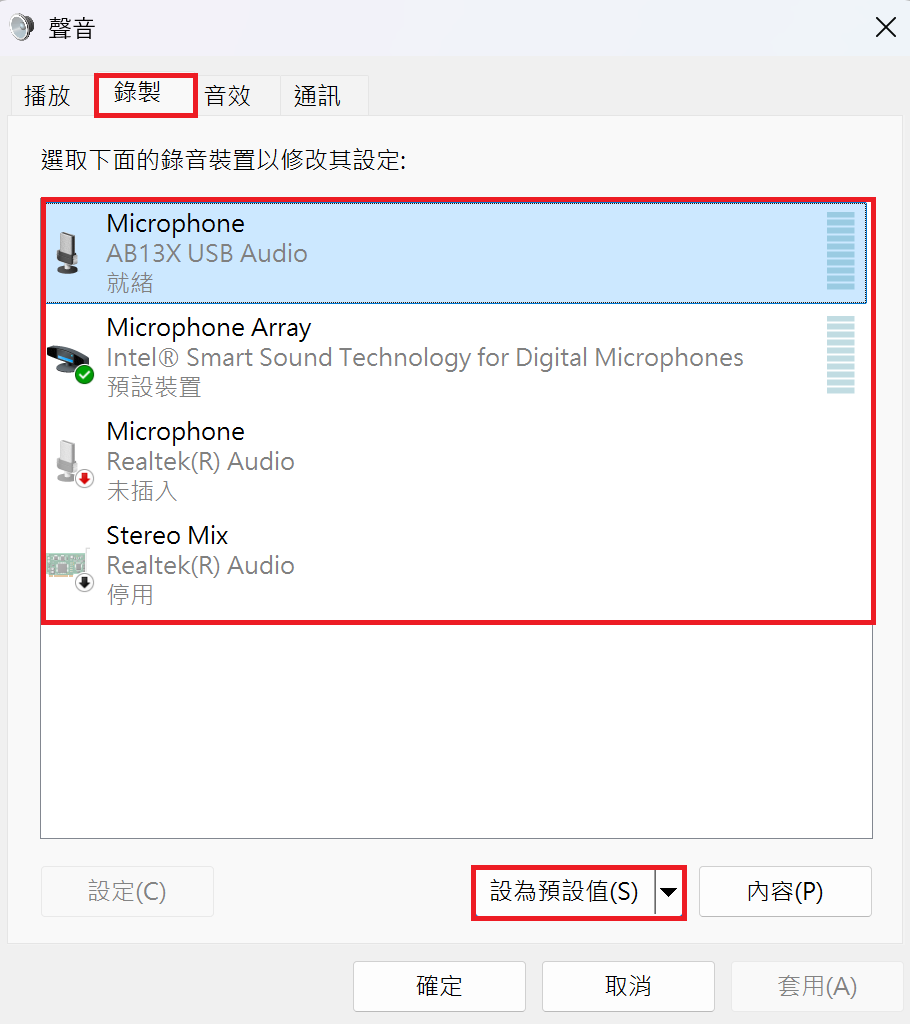 4.點選欲使用的錄製設備后再按下"設為預設值"的按鈕。