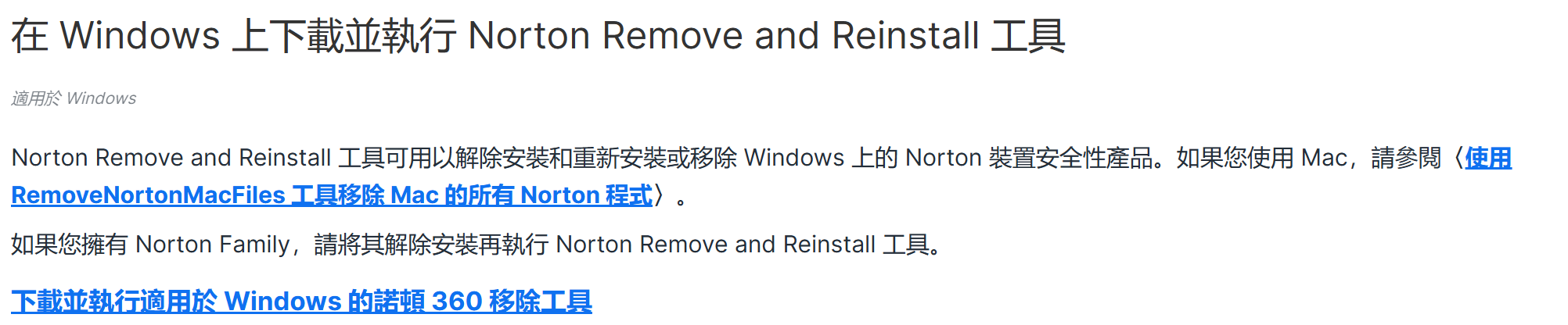 透過 Norton Remove and Reinstall 工具完整卸載 : https://support.norton.com/sp/zh/tw/home/current/solutions/v60392881