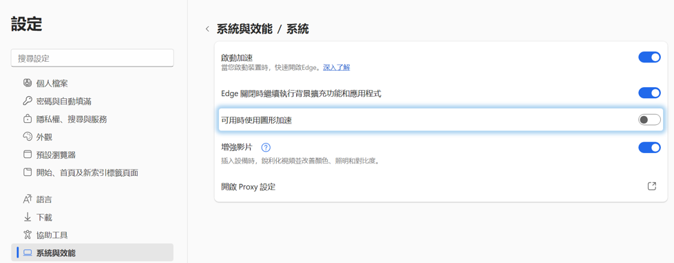 3. 在瀏覽器或應用程式中嘗試關閉「硬體加速」功能