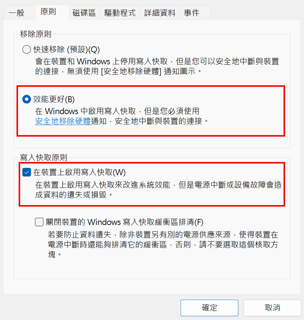 為防止資料遺失或損壞,請注意,在啟用「效能更好」及「啟用寫入快取」後,必須安全地移除外接硬碟後才能移除外接裝置。