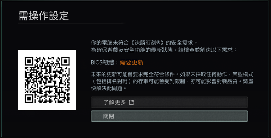 若系統通過合規驗證,但遊戲仍跳出通知要求更新BIOS,用戶可以按下「關閉」 按鈕來忽略此訊息,遊戲仍可以正常開啟並遊玩。
