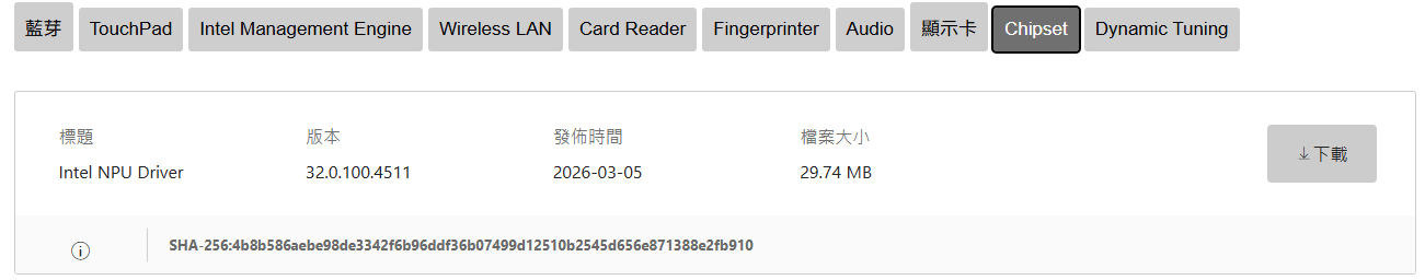 2. 在「Chipset」分類中找到 Intel NPU 驅動程式並下載。