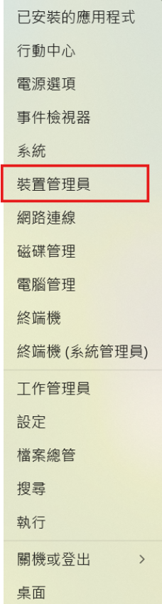 4. 以滑鼠右鍵點擊工作列上的 Windows 圖示,選擇「裝置管理員」。