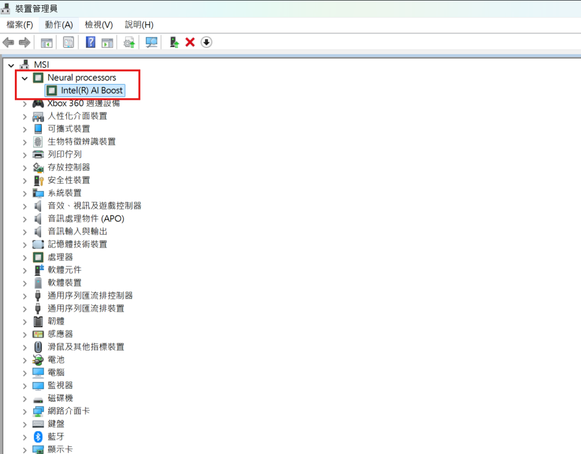 5. 找到「Neural processors」裝置,點兩下展開,並選擇「Intel (R) AI Boost」。