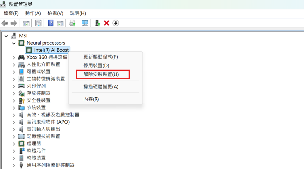 7. 解除安裝完成後,可選擇「掃描硬體變更」,檢查 Intel NPU 驅動是否已完全移除;若仍看得到 Intel NPU 驅動,請重複上述步驟 5–6 再次完整移除,直到確認系統中已無 Intel NPU 驅動為止。
