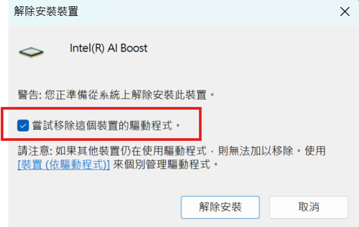 若發現 NPU 驅動程式版本不正確或未正確安裝,請依照以下步驟執行 NPU 驅動程式手動乾淨安裝以排除問題。