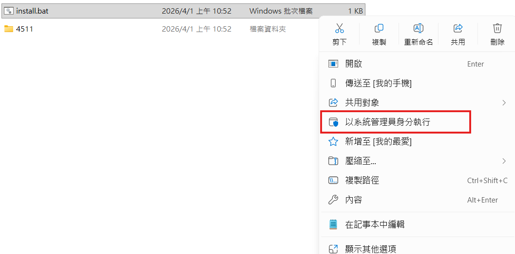 9. 開啟 Intel NPU 驅動資料夾,以滑鼠右鍵點擊 Install 安裝程式,選擇「以系統管理員身分執行」(請等候 Intel NPU 驅動安裝視窗自動執行並結束後,再執行後續步驟)。