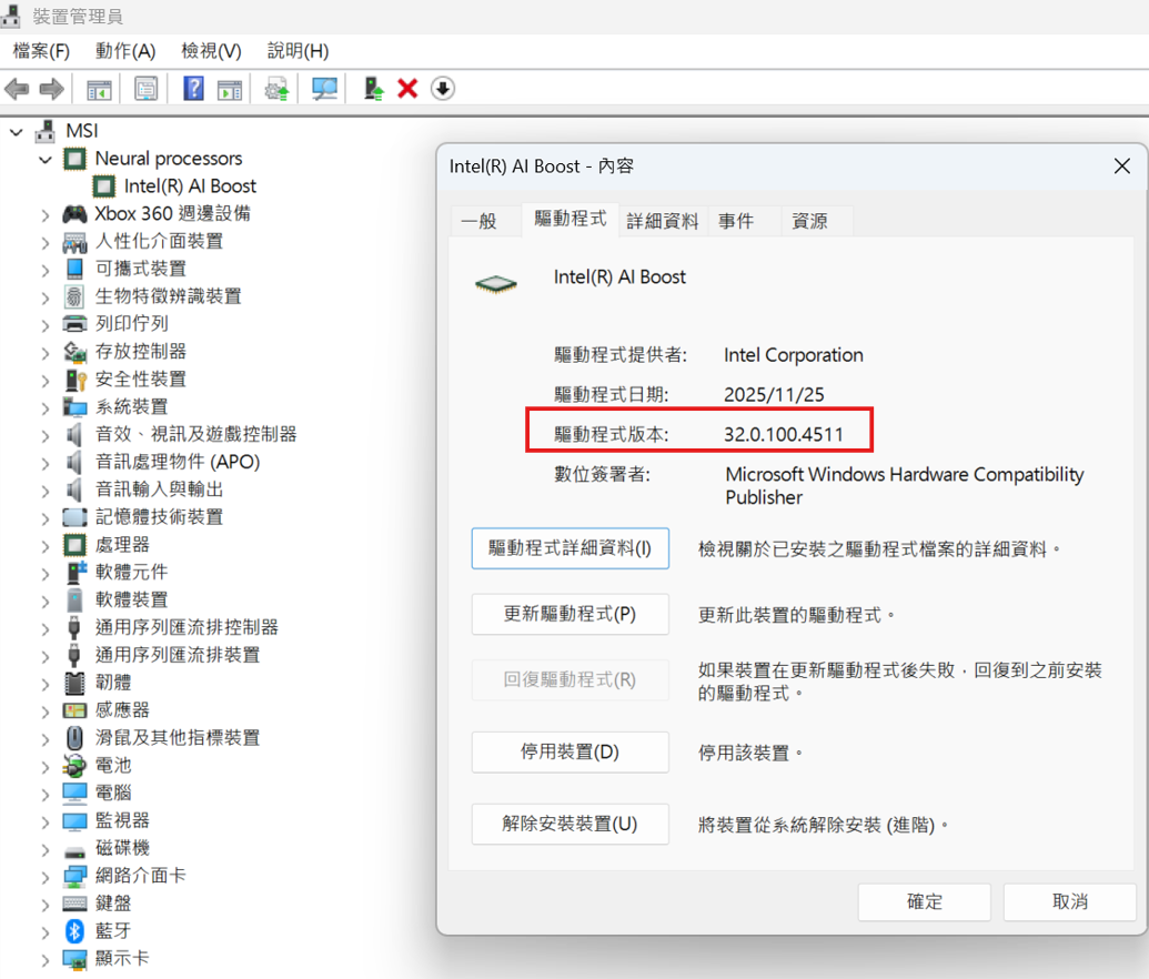 e. 在 Intel® AI Boost 裝置上按下滑鼠右鍵 → 內容 → 切換至驅動程式分頁 → 檢視驅動程式版本。