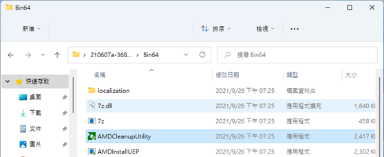 3. 解壓縮驅動安裝包,開啟「Bin64」資料夾,並執行「AMDCleanupUtility」。