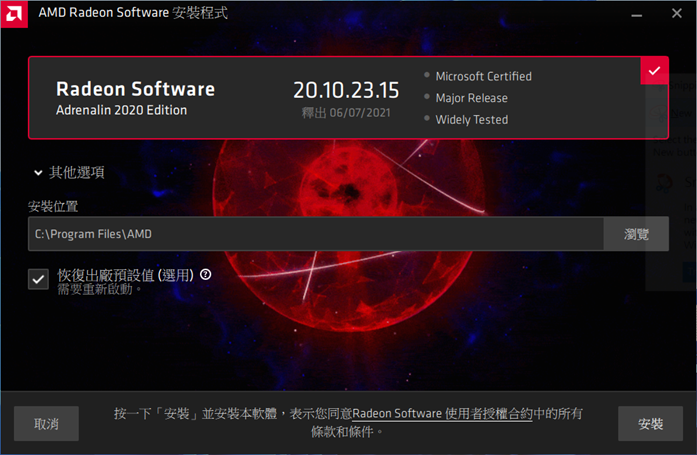 2. 點擊「其他選項」並選取「恢復出場預設值」,點選「安裝」先移除所有舊版AMD Radeon Software。