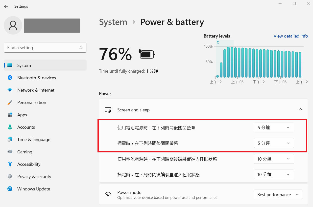 2. 建議將電池電源和插電時關閉螢幕的時間設定為"5 分鐘"後(保持系統預設值)