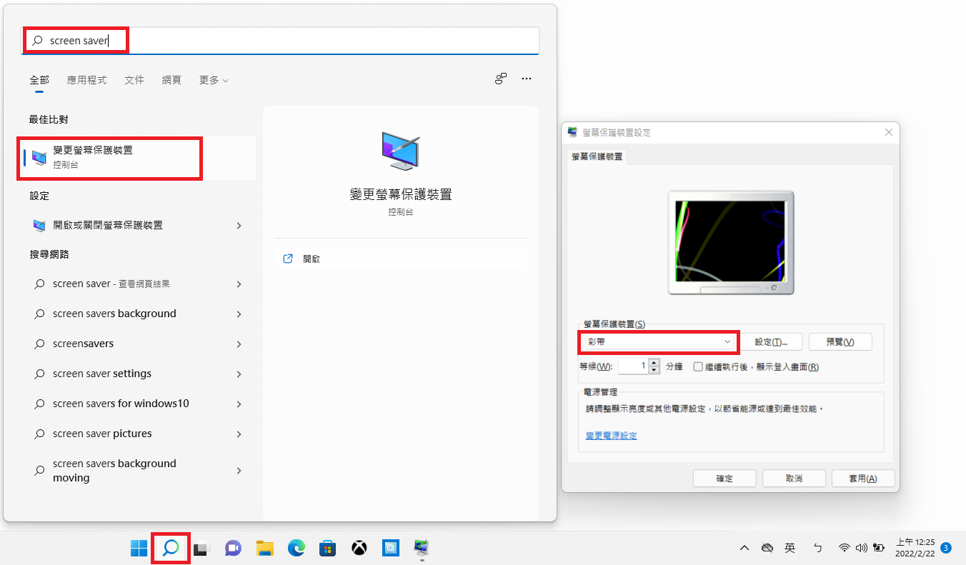 1. 選擇搜尋圖示(或按 Windows鍵 + S)> 輸入"螢幕保護裝置(screen saver)" > 選擇"更改螢幕保護裝置"