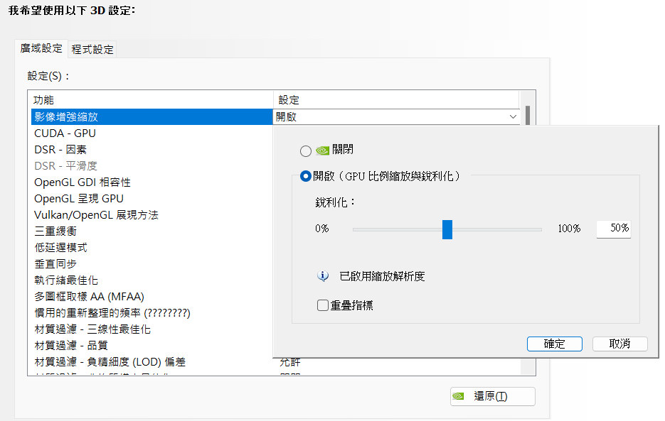 桌面上點選滑鼠右鍵選擇開啟NVIDIA控制面板,切換至"管理3D設置"頁面後調整"影像增強縮放"選項為"開啟"