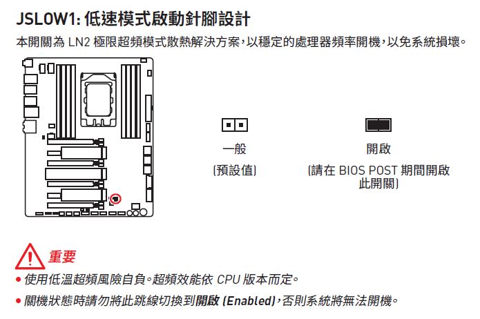 「JSLOW1」針腳是用來啟動低速模式,專為 LN2 極限超頻所使用,請在 BIOS POST 期間跳線此針腳,否則系統將無法開機。